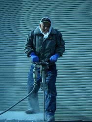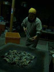 | 寒波に襲われたゲージツ家 石切場での作業は朝八時からだ。 圧搾空気の振動で感覚が麻痺してくる手を休める。 「むかし白蝋病ってのがあったよなぁ」 「血行不良で真っ白くなった 年配の石工さんたちの手を見たことがあります」 ヨシが生真面目に言う。 「ま、昨日今日でハクロウになるわけではないですけど」 石を割るイメージを描き込んだ線に、 オレはまた矢(クサビ)の位置を印し 削岩機を打ち込んでいく。 ![]() 小雪が舞いだした今日の牟礼は 四〇年ぶりの寒波だという。 なんとか今日までに削岩作業を終えてしまおうと、 腰や背筋に痛みをだましながら、 コツはだんだん覚えてきたから作業は早くなっている。 作業中はハツリ孔が曲がらないように 気を遣っているだけで、 ヒマな頭蓋内では どうしてこんな厄介な方法を 選んでしまうのかと後悔したり、 自分の頭蓋から発生したゲージツ・ジカンだから 仕方がないと納得したり。 風がいちだんと冷くなり 石粉に雪が混じってきた五時までひたすら続け、 どうにか全体の形が見えてきて 予定通り削岩は終わりそうだ。 悪寒と吐き気が襲ってきて、 脇の遍路道を独り黙々と通り過ぎて往く 白装束を見送っていると、 白いボルボが滑り込んできた。 この親柱の山梨までの運搬と 設置作業までお願いする 地元のマツヤマ運送のシゲちゃんだ。 「こんな冷やっこいのに、シゴトなぞしてホッコか? 石切場もみんなとっくに休みにして、町は静かだぞ」 身も蓋もないことを言う。 「初ちゃん誘って牡蛎焼きでも喰いにイッかい」 初ちゃんは消防団の分団長だ。 「いいなぁ」 暖かい処に行きたかった。 志度湾に面した漁師町にある牡蛎小屋だ。 漁網や魚箱が積んである寒い土間の 真ん中に下がった裸電球の下、 大きな鉄板が鎮座して周りに木のベンチがあるだけの 殺風景に入っていくと、 「ようお出でなさんした。どこっから来たんな」 手拭いを被った長靴の小さな婆さんが一人出てきた。 言葉のわりにはせっかちで、 牡蛎箱からスコップですくい取って 鉄板の上にザラザラと殻のまま放り出す。 物凄い灰かぐらが舞い上がり、 ありゃりゃ…と思っているうち治まる。 火ばさみと軍手の片方が人数分置いてあり、 婆さんの姿はすでになかった。 ![]() ![]() 殺風景な小屋は暖まっていた。 火ばさみで頃合いのイイ牡蛎を取り、 軍手をはめた左手で抑えて殻をこじ開けて、 ハフハフ言いながら喰うのだ。 殻は足元のガンガンに放り、 すぐに次の牡蛎に黙々と取りかかるのである。 ワイルドなこの喰い方は、美味い。 オレの足元のガンガンがたちまちいっぱいになり、 そろそろ飽きた頃、 「ゴメンゴメン、遅うなった」 初ちゃんが一升瓶とビニール袋を下げて入ってきた。 「高知の川で釣ったんけん。食んまい」 ビニール袋には尺ちかい見事なアマゴが 一〇匹入っていた。 「橙を搾っただけの汁や。純アルカリじゃ」 八百屋をやっている初ちゃんは、 市場で大量に仕入れては搾って 町内の人々に、無料で配る人格者だ。 オレはそのあたりから、寒気と吐き気がはじまった。 今日の寒気はオレの体温とエネルギーを 奪いやがったようだ。 <橙の汁>でも呑んで早めに眠るか。 |