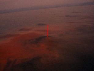 赤い海![]() ゲージツ三昧の山ごもりが続き、 海に漂うジカンがなかなか作れないまま 四月も半ばになってしまった。 久しぶりの釣行は島根県・浜田沖で、 釣った小鯵を背掛けにして ヒラマサを狙うというものだ。 生きたイワシを泳がせて 三kgほどのヒラメを釣ることは 千葉の海でよくやる釣法だが、 一メートル級やそれ以上のヒラマサというから ココロが騒ぐのである。 仕掛けもそれに対応したモノを自分で作ってきたし、 道具にも抜かりはない。 眼下の雲のカタマリを眺めながら、 和紙で創るヒカリのオブジェの構想を深めていた。 一〇〇〇枚の和紙を揃えたFACTORYで 一気に仕上げるつもりだ。 雲を抜けると海が開けた。 陽のヒカリを反射して 紅色に輝く帯が海に広がっている。 しかも浜田の辺りの海岸線に 幾重にも押し寄せているではないか。 ムンクの画にあるようなうねる赤い色が創る 不気味な夕焼けの曲線の連なりだ。 プランクトンの累々たる死骸がつくる赤い海に、 オレが墜ちていくようだった。 不吉な気分と反して、 菜の花がのどかに咲き サクラの花びらが風に舞う浜田の町は、 芽吹きの色に充ちていた。 早速、防波堤に出てみると やっぱし赤潮が漂っていて、 足元に小魚の姿さえ見えない。 仕方なしに小鯵のサビキを出してみるが 全く反応無し。 夕暮れ、鯖の切り身を縛り付けた この地方独特の仕掛けでイカを探ってみるが、 やっぱしダメだった。 急な水温の上昇などで発生するという赤潮が、 こんな広範囲に広がっているとは予想もできなかった。 生き餌の小鯵やイカさえ獲れない酸欠の海で、 ヒラマサはどうしているのだろう。 ここ浜田で五十年漁師をやっている 七十二になるジッチャンが 「こんな赤潮は梅雨時まで続いて、 ヒラマサが回遊するのはそのあとだ。 まだ早すぎる。いま釣れているのは 高島の磯についている<掛釣り>だけだよ」 と言う彼は、小学校しか出てない。 「何だ、その掛釣りってのは」 「沖アミを入れたカゴ仕掛けを流して釣るんだよ」 オレは沖アミのこませで集めた魚を釣る方法は、 ほとんどやったことがないし興味が湧かない。 「ここらの職漁師はやらないし、 もちろん俺もやったことはないよ」 とジッチャンは、 自分で作ったというタコベイトの 年季のはいった仕掛けを見せてくれた。 「沖アミで飼い慣らされたようなヒラマサなら、 しょうがねぇな」 と言いながらも、淡い期待をもって 翌日赤い海に出てみたものの、 魚探の魚影は薄かった。 おまけに潮も動いてない。 ![]() 餌屋で仕入れた小鯵を 作ってきたヒラマサ仕掛けに掛けて出してみたが、 待てど何の反応もない。 ジッチャンも仕掛けを上下させながら、 何一つ反応のない海に頸を傾げるばかりだった。 繰り返す若い船長のジギングも空しい。 快晴の空の下で、 渦巻き模様がますます濃くなっていく 絶望的な赤い海に、 いつまでもロッドがピクリともしない分、 ゲージツ・ジカンが漂う頭蓋内では、 猿沢の池に揺らぐヒカリを宿す 何基もの和紙の大きなオブジェのプランが 出来上がっていき、 なおも続く赤い海の沈黙に 十数トンのトラバーチンを削る 牟礼の石切場まで現れてくるわ、 金比羅の金丸座に創る石の水琴窟が響くのである。 モノとの摩擦係数を過ごしている クローズアップな時間に隙間をつくり、 ただ海に漂っているロングショットな ゆっくりしたジカンはイイものだ。 そんな時、ロッドが突然大きくしなった。 が、ヒラマサの鋭さではなく、 重さは伝わってきても覇気はなかった。 巻き上げると、赤い海面に 赤い大きなメバルが浮き上がった。 それっきりで、船の生け簀の中で 餌の小鯵が腹を見せ始めていた。 「赤潮が入りこんできたから、 小鯵はひとたまりもないねぇ」 船長がすまなそうに言う。 「ヒトの都合に合わせた地球じゃないしなぁ、 ま、このメバルを刺身にして一杯やるかい」 「夏の終わりになれば、 泳がせ釣りで回遊してくるヒラマサが釣れるよ」 船長が微笑む。 初めての日本海の釣果は無惨ではあったが、 初めて眼にした赤い海で取りもどした頭蓋で、 またミクロな摩擦係数との 地道なゲージツ・ジカンに戻っていくのである。 |