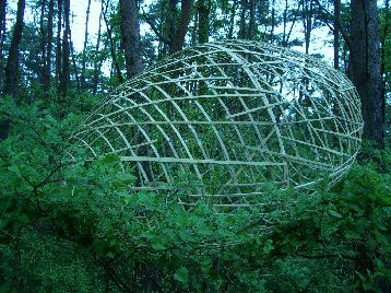 | 茣蓙のうえの竹取 茣蓙に座って二メートルの竹を細く割っては カンナを掛けたヒゴで、ただひたすらに <ヒカリ繭>を創るこのところである。 大きな繭を目指して繋いでいた細い綿糸は、 竹の反発力でどうしても弛み変形してしまって どうにもならない。 ゲージツ家には考え込んでるジカンはないのだが、 手首の回転ストレッチをしていた。 イライラ度が飽和状態で回転が速くなっていた。 <ハッカー>の使い手だった鉄筋工の頃が 手に甦っていた。 ハッカーといってもコンピュータの愉快犯ではない。 鷲の爪みたいに鋭くなった先が回転する機具で、 コンクリートを流す前に骨になる鉄筋を 針金で結んでいくのである。 東京オリンピックが迫っていた首都東京は、 クラッシュアンドビルトの真っ盛りで、 オレは古いビルの解体や、地下鉄工事など 肉体を駆使した労働でゼニを稼いでいて、 スコップで垂直に深く土を掘るのが早かったが、 鉄筋工としてもシゴトが早くて 親方に褒められたものだ。 今は重機が全盛だから スコップを使う土方シゴトは見当たらなくなった。 しかし先日GARAの墓穴を掘るときには役に立った。 ムカシ使っていた<ハッカー>が 道具箱のなかで錆びていたが、 油をくれると大事な回転部分と爪先は まだ充分に使えそうだ。 綿糸を止めて針金のタスキ掛けにして締めると 弛みもなく、シゴトも一気にはかどった。 今頃こんな場面で 役に立つ技を覚えていた手はアリガタイ。 今回は小さな<ヒカリ繭>だが、 八月の奈良での本番は 直径三メートルの巨大なモノになる。 その時は野にはなっているスタッフを結集し <ハッカー>旅団となって大シゴトに立ち向かうか。 「アレ、今度はウサギ獲りの罠でも 作っているのけぇ」 ![]() ウルシかぶれの薬を 早々と持ってきてくれたドクトルだ。 「罠かぁ…」 竹の骨組みだけを見れば 誰だってそう思うに違いない。 「ヒカリ繭だよ」完成を説明した。 「幻想的だねぇ。 ああ、これでなきゃダメ、ウルシかぶれは」 幻想的なぞというコトバの似合わない酒呑みドクトルは、 甲斐駒の頂に眼をやりながら呟いた。 京都の尺八の製管師・村田朋山は演奏家でもある。 解体された三〇〇年前の家の 屋根裏を支えていた煤竹で、 オレの尺八を作ってくれたのだが、 <ヒカリ繭>の制作に飽きると 茣蓙の上に座ったまま 新しい尺八で練習していた。 ところが管の地塗りのウルシが まだ完全には乾燥してなかったらしく、 下唇の下が歌口の形に 丸くかぶれてしまったのだった。 「すぐに治るだよ。しばらくウルシが乾くまで 吹かない方がイイだね」 ドクトルはそそくさと 寝たきり婆さんの往診に山に向かい、 オレはシゴトに戻った。 「温泉に行って一杯やるかい。 根の詰めすぎは毒だよ」 夕方、大成建設の所長・金ちゃんが迎えにきた。 久しぶりに広い温泉の露天風呂に浸かって、 彼が手に入れた芋ショーチューを持ち込んで呑んだ。 十二月に設置する中央病院の石の大彫刻にも そろそろ掛からないとなぁ。 六月から牟礼の石切場に何度か通っての制作だ。 |