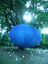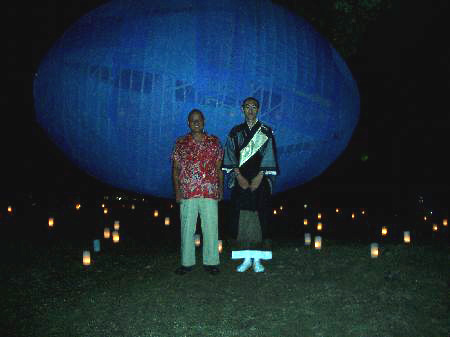 | ヒカリ繭ついに浮遊す 役人フクノは直接県民のための <余計シゴト>に野人の本領を発揮する。 ここがコッパヤクニンとは根本的に違うのである。 彼が運んできた太い竹を、 須田さんが荒縄でくくり <ヒカリ繭>を載せる御輿に仕上げた。 担ぎ手は八人、準備は万端だ。 なんとか颱風を追っ払った夕暮れ。 仮設工場から運び出しクスの樹に向かって コツゼンの御輿が丘を往く。 先棒のオレには、 シルエットになっている南大門や 大仏殿の輪郭からヒカリが放射して見えていた。 クスの樹にヒカリ繭が浮遊する。 ![]() 二月堂の塔主住職・森本公穣さんは、 墨衣に包んだ一九〇センチの長身で 繭のそばに立っていた。 仮設工場で制作中の炎天下や、 雨の大仏殿わきの土塀を歩きながら 頭蓋内のヒカリと遊んでいるオレの前に、 彼はいつもコツゼンと現れた。 お勤めの途中の彼と出会ってしまうのである。 つかの間、ヒカリや土についての 立ち話をしたものだが、 「七日は年に一度の大仏様の御身拭いがあります。 私の独断でKUMAさんも 左掌を担当する組に登録させていただきました」 と言う。ヒカリ繭を大仏の左掌に 載せたかったんだとトウトツに言った 本音ともつかない乱暴な無茶に、 このような形で戒めてくれたのだ。 「光栄な御縁だね」 と答えたもののオレにはまだ現実的ではなかった。 ルシャナ仏をイマジネーションしたイニシエ人たちが 巨大に写した鋳造に、 華厳のエネルギーを直に感じる七日は 愉しみなことである。 ![]() ![]() ヒカリ繭のなかに二十三個のヒカリが灯し終わると 「ついに出来上がりましたね。それにしても大きいです」 公穣さんは相変わらずコツゼンと穏やかに微笑んでいた。 燈花会のボランティアたちが灯すロウソクが 点々と拡がって物凄いヒト等が そのヒカリの間を流れて往く。 野人フクノもカーペン兄弟、須田さん、 みんな黙って青い<ヒカリ繭>を眺めていた。 やがてヒカリ繭の周りはヒト等に埋まっていく。 彼等のなかに青いヒカリが揺らいでいたはずだ。 九時、空っぽになった仮設工場。 野人フクノ、ウッカリお茶茶、 カーペン兄弟、須田さん等と 暗がりの中の工場を清掃。 東へ戻るカーペンのワンボックスに、 今回の奈良入りで初めて乗った新幹線に懲り懲りした 須田さんも同乗した。 明日から、村の日常に戻り、 横浜の大工に戻っていく彼等の日常にも 青いヒカリ繭が羽化していくのだ。 繭を紡ぎ終わったオレもちょっとくたびれたが、 猿沢の池の近くで残った野人、御茶々、 スリーピーとショーチュー。 ヒカリ・ハイのまま明け方宿に辿り着く。 |