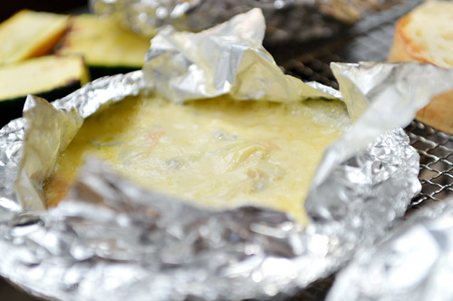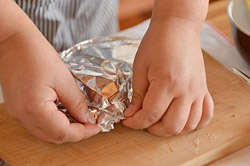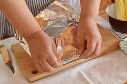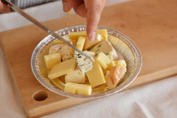 アルミ皿に、粗く刻んだチーズをのせます。 |