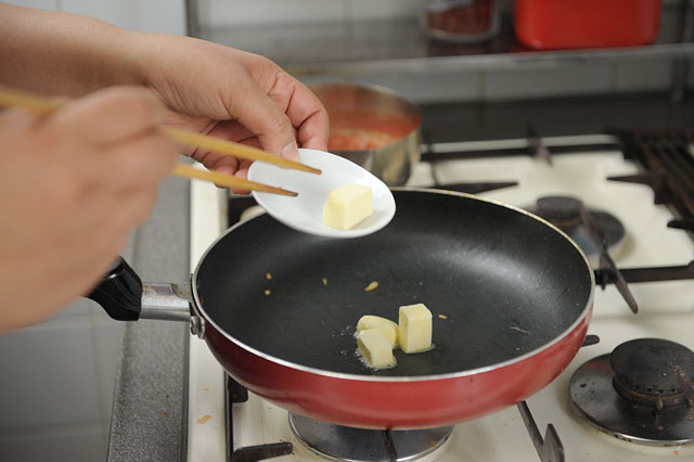のびた(のばした)スパゲッティを炒めて、ほぐすのです。