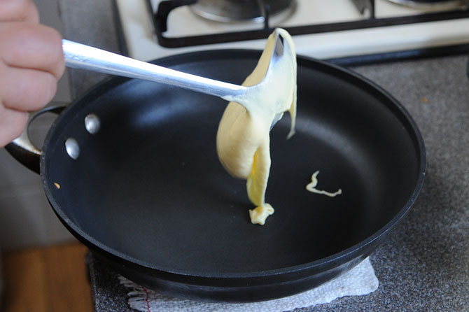 ぬれぶきんの上に乗せてちょっとだけ冷ましてから、タネを流し入れます。