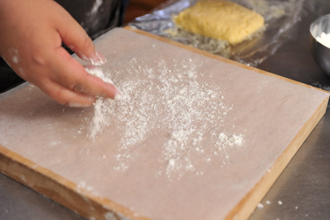 クッキングシートをひろげ、打ち粉をします。