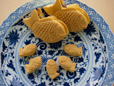 レジ横に尻尾を紐でつながれた等身大の小鯛焼きを1尾、
