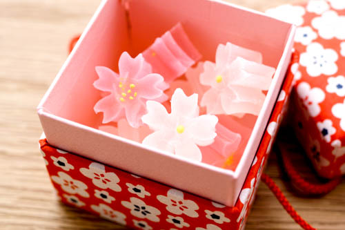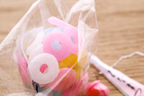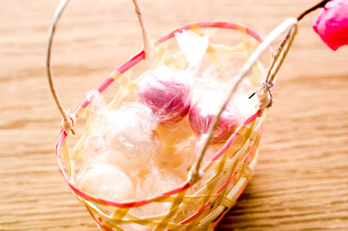桃色をはじめ、明るく淡い色とりどりの菓子が