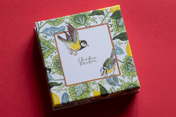 1羽は、枝みたいに描かれた枠にちょこんと止まってます。