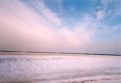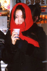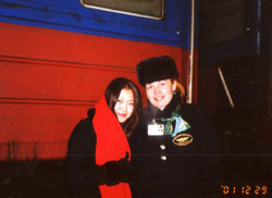 12/29/2001 シベリア鉄道の旅 DAY 3 ハバロフスク着。 ![]() 早朝、ハバロフスク着。 お世話になった車掌さんと記念写真。 最初はクールで厳しい人かと思ったけれど、 最後には照れやさんだと分かった。握手をしてバイバイ。 クルーがまだ暗いハバ駅の撮影をする間、 雨宮さんと二人で待っていた薄暗い待ち合い室は ものすごく寒く、 ウラジオでは感じなかった‘シベリアの寒さ”に いよいよご挨拶..。 かろうじて開いていたキオスクでコーヒーを買う。 ![]() 雨宮さんが飲みかけのコーヒーをちょっと置いた瞬間、 ホームレスのお兄ちゃんの手が伸びてきて、 堂々と飲まれてしまうので、ビックリ。 少し残してテーブルに置いておくと すぐに“吸収”される。 西野さんに聞くと、少し残したら ホームレスの人のためにそのまま置いておく、 それが暗黙の了解なんだそうだ。 隣のおばちゃんも魚のフライ? のようなものの 食べかけを置いて行き、 同じお兄ちゃんにすぐに“吸収”されていた。 壁にある古い大きなシベリア鉄道の路線図を見ながら、 まだまだ全然先は長い...と実感する。 シベリア鉄道はロシアの下のほうを 通っているみたいなので、 シベリアの北のほうの途方もない 未開の土地を想像して気が遠くなる。 ロケバスで駅からホテルへ移動。 バスから見た町並みは、 黄色がかった街灯の色で雪がぼやけて綺麗。 15分ほどでホテルに到着。 9時の朝御飯まで仮眠をとるはずだったのに、 だんだん白んでいく空を見ながらボーッとしていたら 8時くらいになってしまい、 2、30分しか眠れなかった。 ボーッとしながらの朝御飯。 知らないうちにカメラクルーはもう出動していた。 だだっぴろいレストランはすきま風が入るのか、 薄着では鳥肌が立つ。出てきた料理もヘンで、 コーンフレークのミルクが生暖かかったり、 コーヒーはぬるく、 すべてが微妙でちょっと悲しかったが、 全体的なビミョーさがだんだん可笑しくなってきて、 雨宮さんとずっと半笑いのままの朝御飯だった。 ![]() 11時LOBBY CALL。 先に早朝の実景を撮りに出ていたクルーが帰ってきて、 「寒い!!!! ヤバイっっすよ!!」 とおどかす。 ためしにコートなしで外に出てみようとして、 ドアを開けた途端あまりの寒さに 反射的に室内へUターン。 部屋に帰り、さらに着込んで、ダルマ状態。 今日はNational Standardのワカ (デザイナー若林さん)から頂いた ベージュのダウンを着てみる。 20471120のみふー(御船さん)にもらった ムートン帽子も持って。 皆、シベリアに行く私を心配して、くれたもの。 みんなに守られて歩いている感じがする。 絶対に履きたくなかった巨大な雪靴にも、 早速お世話になる。 ![]() スキー靴を履いている時のように うまく歩けないモコモコ姿で、 意を決してガラスの重いドアを開けると、 その瞬間、身体の内部がキュンと冷たくなる。 これがあの有名な「鼻が凍る」現象か! 鼻の中が、パリッというかサクッというか、 霜がおりてるなーという感触。 気温、マイナス15度。 ![]() ロケバスが坂を上がっていくと、 真っ白い展望台が見えてくる。 ドキドキしながらバルコニーのようになっている 展望台の中に入ると、 目に飛び込んできたのは、アムール河。 視界の隅々にまで広がる、広大な氷の大河に、 圧倒されてしまう。 向こう岸までテクテク歩いている人もいるし (対岸に別荘を持っている人々らしい!)、 なんと車も走っているし(危ないってば!)、 氷の上で工事までしている(なんのだよー!)。 唖然。これがシベリアの規模..。 ふと、鳥の鳴き声が響く。 下を見ると、白黒の鳥が何羽か飛び交っている。 再度ロケバスに乗って、下の河のところまで降りて行く。 まるでビーチみたい。 眩しくてたまらない。 サーシャによると、 通常50センチほどの氷が張っているが 今年は暖かい(!)のでそれより薄いかもとのこと。 いよいよ、河の氷の上へ。 おそるおそる、足を踏み出すと、 砂利の上に積もった雪とは少し違う音がする。 ホントに落ちない? 割れない? びくびくしながら、一歩一歩。 でもすぐに、びくともしない氷を足が "地面"と認識し、慣れてしまう。 ![]() ディレクター上野さんに 「音を見つけられるまで」 と言われたので、好きに歩いて行く。 ハイになる。 ずぅっと歩いて対岸まで行けそうな気がする。 方向を見失いそうだけれど。 しばらく歩くと、氷が平たんではなくて 波のような形になっていることに気付いて、感動する。 風の形か、波の形か。 でも氷の下は、いつも通り川が流れている...。 ずっと耳をすましていると、 風の音が、まるで波の音のように まるく、甘く、流れてくる。 それがアムール河でみつけた音、 ただの風の音じゃない、 氷の大河の上でしか聞けない、 感じられない、風の声だ。 その後、同じ河の別の場所へ移動する。 もう河の上を歩くのも慣れたものだ。 釣りをしているおじさんの所へ歩いて行く。 よく写真で見るように、 氷に穴を開けて糸をたらしている。 おじさんの足元