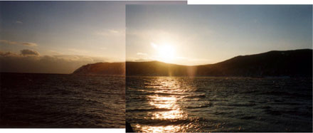 夕方のオレンジを帯びた太陽の光が水面に反射して、