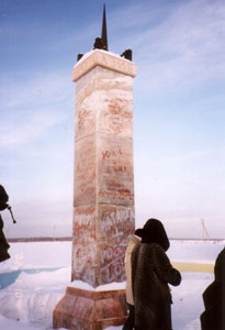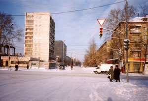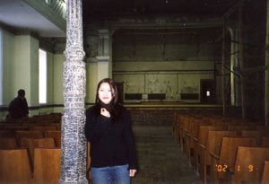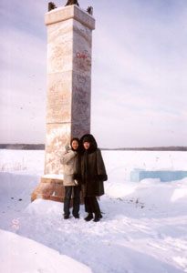 1/9/2002 シベリア鉄道の旅 DAY 14 PART 1 ウリァーナのエカテリンブルグ案内。 今朝も、ものすごーーく寒い。 昨日の別れぎわの‘9時にダムでね。’の約束通り、 朝まだ暗い9時前に待ち合わせ場所に向かう。 ダムのある広場に、 茶色いコートを着込んだウリァーナを発見。 こういうアバウトな約束、なんだかうれしいなぁ。 渋谷なんかだったら 50cmしか離れていなくても 人が多過ぎてお互いを見つけられなかったりするのに。 ウリァーナ流エカテリンブルグ・ツアーのスタート。 まずは、すぐ近くの、 ウリァーナが通っている音楽学校見学。 ダムのすぐ近くにある学校。 目の前にチャイコフスキーの銅像がある。 チャイコフスキーの母校? と聞くと、 そういうことでもないらしい(?)。 建物の中は殺風景なくらいで、足音が響く。 まずは、すごく古い楽譜なども保存してある ライブラリーに案内してもらう。 1800年代のものや、 300年前の歌の楽譜などもある。 これはブタの革の表紙。 昔は、楽譜一冊が牛100頭分! の値段の物もあったらしい。 音楽を楽しむことは誰でも出来ることだけど、 専門的に学んだり楽譜や楽器を手に入れたりすることは 貴族の特権だったのだろう。 歴史ある楽譜は、手書きのもので、 タイポグラフィーやデザインなども美しく、 本当に素晴らしい。 博物館などにあってもおかしくない、国の宝だなと思う。 ビクターという、 とても人の良さそうな校長先生に紹介される。 ウリァーナも優秀な生徒という感じで、 校長先生も誇らしげ。 天井の低い廊下を通って、 他にも教室を幾つか見せてもらうが、 ピアノの個人レッスンをしていた教室で見た 真っ赤なピアノには、衝撃を受けた。 そのピアノの名前は‘mockba’=モスクワ。 ロシアでは美しさの象徴の深紅のピアノ。 慣れ親しんだ、ぬくもりのある音ではなく、 ピンと張った、でも上品な音をしたピアノだった。 その後、築100年の古いホールを見せてもらうが、 今は修理中で(というか資金の問題で それも滞っているらしいけれど)使われていない。 とても美しい作りで、 音響的にも特異な作りになっているらしい。 ステージで発せられた音が、 ホールの全体を包むような設計になっている。 ステージは広くて、上がるととても気持ちがいい。 100年前の紳士淑女達がドレスアップして 音楽会に集っている光景が想像できる。 早く復活するといい のになぁ。 そのあと、校長先生の部屋で 幾つか古い民族楽器の笛を見せてもらった後、 もう一つの使える方のホールで、 ウリァーナちゃんのピアノ演奏を聞かせてもらう。 友達のフルートとのデュエット曲で、 なんと彼女が作曲したのだという。 彼女がピアノに向かう姿は気品に溢れて、 とても年下とは思えない。 楽曲にもものすごい才能が滲み出ていて、 心底びっくりしてしまった。 でも彼女はそれを当然のようにやっていて、 「なんですごいの?」という感じなので、 自分でも同じくらいがんばっているだろうか? と焦りを感じるほどだ。 その後また古いホールに移動して、 民族楽器のアコーディオンと バラライカの演奏を聞かせてもらう。 3人の学生はマキシム、アレックス、アレクサンドル。 バラライカで弾いてくれた曲は、テトリスの音楽(笑)。 アコーディオンは、はば広い音階が出せて、 ピアノのように一台でメロディーと ベースラインが成り立つ。 細部にまで装飾が施してあり、機能的でもある。 見ているだけでうっとりしてしまう楽器。 演奏後色々質問している時に、 3人の学生に「趣味は?」と聞かれて焦る。 趣味、といわれてもなぁ‥‥。 文章を書いたり何か作ったり‥‥としどろもどろ。 学校を出て、バスでウリァーナの家に向かうことにする。 一般のバスに乗るのは初めて。 バスターミナルに入った途端、 ロシア美人と異国人との組み合わせが物珍しいのか、 ものすごい人数の注目を浴びて、 ビクビクしていたらウリァーナちゃんが ぐんぐん引っ張っていってくれて、たのもしい。 とにかく寒くて、足の先が凍傷になるかと思った‥‥。 相当の人数がバスに乗るために並んでいたが、 なんとか乗れて、何故か席はまだ幾つか空いているのに 立っている人も大勢いるのが不思議だった。 日本みたいに皆こぞって座ったりしないみたいだ。 外の景色が見たいけど、 窓が真っ白く凍りついて何も見えない。 ガリガリガリガリ氷をこそげ落としても、 すぐまた曇って凍ってしまう (何度も言いますが、これ内側ですよ!)。 30分くらい乗って、ウリァーナが途中で降りるという。 バスを降りると、目の前にはアジア大陸と ヨーロッパ大陸の境界線のオベリスクが 何も無い真っ白い雪原にポツン建っている。 どこの国の人もやることは似ていて、 オベリスクには無数のサインやハートの中に カップルの名前が‥‥(日本だったら相合い傘?)。 私達もはしゃいで、境界線を飛び越えたり、 線をまたいで立ったり、 ウリァーナと手を繋いでオベリスクに手をまわすという 