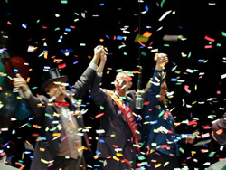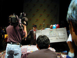 | アメリカモノポリー事情(7) 〜NY、「聖地」アトランティックシティに 行ってきました(7)〜 「モノポリー米国選手権の巻その3」 決勝進出者は世界選手権同様、 ハズブロ社が用意した タキシード(男性)やドレス(女性)に着飾り、 決勝の舞台は十分整いました。 楽団の演奏するマーチにのって、 大会参加者並びに決勝進出者が入場し、 最初に大会参加者が一人一人の名前を読み上げてもらい、 出場証明書を壇上にて贈呈されました。 また決勝開会のあいさつをされた副社長から、 私も紹介してもらいました。 ついで決勝進出者が呼ばれ、いよいよ決勝がはじまります。 ゲーム展開ですが、 ある一人のプレーヤーが 「ダークパープル」という一番安い土地を ダイス(サイコロ)だけで独占し、 続いて前回チャンピオンの友人が 「ダークブルー」という一番高い土地を 同じようにダイスだけで独占しました。 <注:「ダイスだけで独占」とは、 人とは一切交渉せず、 自分出したダイスの目によって購入し、 自力で独占すること。> この後、この方が「ダークブルー」以外の権利書を 安価で他のプレーヤーに売って、 ダークブルーの経営に専念します。 ただ、ダークパープルのホテルにつかまったり、 他の権利書を買うためにダークブルーの家を崩したりと、 経営がそんなに順調でなかったためか、 他のプレーヤーの追随する動きが緩慢でした。 結果としては、 ダークブルーの経営が軌道にのってしまった後は、 特に山場らしいものがなく、 押し切ってしまうことになりました。 くしくも、ダークブルー6軒→ ホテルからイエローホテルとなり、 最後はベントノールで仕留めたところは、 私の世界選手権決勝と全く同じでした。 表彰式も非常に華やかなもので、 優勝賞金は世界選手権と同じ$15140が贈られました。 私も、新チャンピオンのお祝いをさせていただきました。 新チャンピオンが衆目の面前で 携帯電話にかかってきた 知人からのお祝いに応えている光景が、 2003年という時代性を物語っているようにも思えました。 ![]() もちろん、表彰式後に新チャンピオンがサイン攻め、 取材攻勢にあったのがいうまでもありません。 この様子はケーブルテレビ局、並びにAP、ロイターなど 各メディアを通じて、 全米に配信され、ヤフーでのニュースとしても 取り上げられていました。 |
