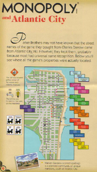 | アメリカモノポリー事情(8) 〜NY、「聖地」アトランティックシティに 行ってきました(8)〜 「モノポリー in アトランティックシティの巻」 昨年暮れに書き始めましたこのコラムも ようやく終わりの回を迎えました。 筆不精な筆者に長らくお付き合いいただきまして ありがとうございました。 最終回も興味をもって読んでいただければ幸いです。 さて米国選手権は予定どおり午前中に終わり、 私も取材や関係者への挨拶なども終えましたので、 その後はアトランティックシティを 観光することになりました。 このコラムの 「最古のモノポリーの巻」の回でも記しましたように チャールズダロウが今の米国スタンダード版と ほぼ同じモノポリーを考案したのですが、 そこではアトランティックシティの 各土地、交通機関の名前を ほとんどそのまま使っています。 ちょっとみづらいかもしれませんが、 米国選手権でメディア向けに配付された資料で その様子がわかります。 そこで私もモノポリーの「香り」をここで探してみました。 ![]() アトランティックシティは ニューヨーク州の隣の州にあるカジノリゾート地でして、 週末ともなればニューヨークからの観光客を中心に ごったかえします。 当然カジノにもモノポリーらしいものがあります(笑)。