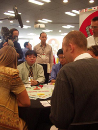 | 世界選手権2004日本大会報告 〜第8回:実力発揮できず、 植田選手の1回戦〜 こんにちは。 日本代表・植田選手の最初のゲームが続いています。 いまさらようやく、アイルランドがうまいこと立ち回って いい条件をゲットしたようだと、 ほかの国の選手たちも気づきます。 その後もこのアイルランドのアンソニー選手は、 次々と「辣腕」ぶりを発揮していきます。 例えば負債交渉において、アンソニー選手は、 ダークブルーやライトパープルなどの権利書を かなり高額で査定して「抑え」にいっています。 他のプレーヤーが経営するカラーグループを減らすことで、 リスクを減らす戦法です。 更には、いったん家を4軒建てていた 自分のダークブルーを 自主的に崩してまでして現金を都合して、 グリーンを引っ張ってきたりもします。 このあたりを見る限り、 少なくとも終盤の「ヨセ」(注)の技術は 高いものがあると感じました。 (注)「ヨセ」の技術: モノポリーはその他のボードゲームと違い、 終盤でも逆転できるゲームですので、 途中でリードしていても油断していると 簡単に負けてしまいます。 リードしてから実際に勝利を決めるまでの技術こそ、 トッププレーヤーと それ以外のプレーヤーを分けるといえるでしょう。 逆転の可能性を1つ1つ封じていくことで 確実に1位を不動のものにしていくスタイルは、 今回の順位ポイント制システムに合った戦略であると 思われます。 ただ、そのせいか、ゲーム時間が長くなってしまい、 最終的にはモノポリー決着できなかった模様ですが。 先に言ってしまいますと、 このアンソニー選手はその後決勝戦まで進出するのです。 なかなかの腕前を持ったプレーヤーであったと思います。 日本の植田選手は、 いきなりの700ドルに突っ込んでしまった後 なんとか体制を整え、 体力を回復して再起をうかがおうとします。 前述のグリーンの負債交渉でも価格を吊り上げるなど アンソニー選手に独走させるまいとがんばりますが、 遂にチャンスカードで 致命的なカード「イリノイに行く」を引いてしまい、 とうとう仮破産。 ここではなんとか救ってもらえたものの、 結局破産して初戦を終えます。 日本期待の2選手のうち、 植田選手は残念ながらいきなり破産。 波乱のスタートとなりました。 もう一人、世界チャンピオン岡田選手の様子は どうでしょうか。 植田選手と同時に第1ゲームを戦っているはずです。 見ると、なんとアメリカのダークパープル (交渉ではなく自力で揃えたようです)以外、 どこのカラーグループも全く揃っていません。 まるでゲーム序盤のような盤上。 残り時間もあとわずかというのに こんな状態では全員共倒れの危機です。 岡田選手、非常に苦しそうな表情です。 ![]() (浮かない表情の岡田選手) いったいこのテーブルでは何があったのでしょうか。 なぜこんな展開になってしまったのでしょうか。 続きは次回に。 |