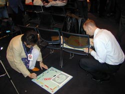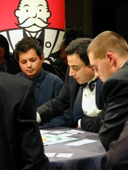 | 世界選手権2004日本大会報告 〜第16回:決勝戦前編、場内震撼の展開に〜 さて、決勝戦が始まりました。 まず注目すべきは、開始30分経過したところで スペインがオレンジの権利書3枚を自力したという点です。 この時点でスペインのアントニオ選手は、勝負をかけます。 手元に残った権利書のうち2枚を抵当に入れて現金を作り、 オレンジに家を7軒建築します。 表で残っているのは公共会社の電力水道のみです。 この電力水道までをも裏にすれば、 更に1軒は確実に建てることができますが、 そこまではしないようです。 ![]() 大事な決勝で、 最強のカラーグループと呼ばれるオレンジに 早くもかなりの家がたつ展開となり、 場内は騒然! ![]() 緊迫した展開に、 選手の眼光にも緊張感がみなぎる。 ![]() 有利な展開のスペイン、何を思う? スペインの建築を見届けるように、 ポーランドとノルウェーが交渉を始めます。 さすがにこの交渉は迅速にまとまった模様です。 ほどなくポーランドが裸でイエローを揃えました。 イエローにはまず家が5軒建ちます。 手元にはもう1軒分くらいの現金が 残っているようですので、 これは有望な追撃態勢といえます。 ノルウェーは鉄道3枚を持ちます。 アイルランドは まだこれといった収入源になるような形にはなっておらず、 グリーンやライトパープルなどの まだ権利書全てが売り切れていない カラーグループの権利書ばかり。 すぐに家がたつ展開ではなく、これからに期待ですね。 予選1回戦でお見事な先行逃げ切り、 「ヨセ」の技術を披露したアイルランドですが、 この「追撃」の立場に回っての手腕は いかがなものでしょうか、拝見したいところです。 このあと、ノルウェーがぞろ目でオレンジ、イエローに 連続して着地します。 どちらも家が2軒建っている土地でしたので、 スペインに200ドル、 ポーランドに330ドルの支払いをします。 これでカラーグループはどちらも育ちやすい形となり、 このままいくと スペインとポーランドの一騎打ちとなりそうです。 特にアイルランドは何か動かないといけません。 ノルウェーは次の番で、チャンスカードをめくります。 めくったカードは「修理費」。 家を建てていないノルウェーが 修理費を引いてしまいました。 そしてその直後には、 スペインがチャンスのマスに止まったのです。 もしスペインが先にこの「修理費」を引いていれば、 オレンジの増築に待ったがかかっていたはずでしたが、 この頃から追い風はスペインに吹いていたようです。 さてその頃決勝の舞台裏では、 参加者どうしのサインが大流行。 ちなみに一番人気はミスターモノポリー! さすがですね。 ![]() 選手は互いにサイン交換 ![]() サインに大忙しのミスターモノポリー ![]() ボード一杯に広がるサインの数々 続きは、次回。 |