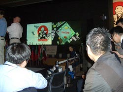 | 世界選手権2004日本大会報告 〜第17回:決勝戦後編、新チャンピオン誕生〜 こんにちは。 世界チャンピオンが決まる決勝もいよいよ佳境です。 決勝卓を取り囲む国際色豊なメディア陣も ヒートアップしています。 ![]() 決勝卓のまわりはカメラの放列 決勝戦でスペインがオレンジを自力、 対抗してポーランドがイエローを経営開始、 といった局面のその後です。 アイルランドとノルウェーはようやく交渉をまとめ、 アイルランドがライトパープル、 ノルウェーが鉄道4枚を揃えました。 ちょっと遅かった気もします。 特に鉄道は早めに4枚にしておかないと、 オレンジやイエローへのけん制効果になりません(注)。 事実、この後のオレンジは余裕で増築して 4軒ずつに増やしています。 (注)鉄道の効果: オレンジやレッドといったカラーグループは 権利書をそろえ、建設料を払って家やホテルをたてて、 その土地に泊まったプレーヤーからいただく レンタル料を高くします。 一方、鉄道や電気・水道は家やホテルを 建てることができません。 しかし、鉄道は2枚になれば1枚の時の倍に、 3枚なら1枚の時の4倍に、 4枚なら1枚の時の8倍に、 それぞれレンタル料が大幅に増額されるので、 家やホテルを立てて手持ち現金が少なくなりがちな カラーグループ経営者にとって、 なかなかの脅威になります。 そしてそのオレンジに、ポーランドが止まってしまいます。 イエローは崩壊。 この瞬間にゲームはかなり傾いてきました。 アイルランドには家が1軒ずつしか建っておらず、 対抗勢力たりえません。 このままではスペインの勝利は誰に目にも明らかです。 唯一お金を持っていたと思われるのはノルウェーですが、 鉄道とイエローを交換する交渉は 提示しているのかいないのか、 何度か話はしていたようですが、 権利書が動く気配はなく、 そのままゲームが進みます。 そうこうしているうちに、 アイルランドのアンソニー選手が ニューヨークのホテルに着地。 これは救済されず、破産となります。 アンソニー選手は、 予選では上手な先行逃げ切りを披露していましたが、 追いかける側の立場となった決勝戦では、 これといった見せ場もなく消えていきました。 またの活躍を期待したいところです。 選手は残り3名となりました。 圧倒的に有利なのはスペイン。 残り2国、ポーランドとノルウェーは 協力して立ち向かわなければならない場面です。 ポーランドはイエローに家が2軒ほど残っていますが、 もちろんこんな勢力で オレンジホテルにかなうとは考えられません。 一方のノルウェーは、 一回オレンジホテルに突っ込んでおり、 苦しいことは苦しいのですが、 それでもなんとかできそうな場面。 私見ですが、ここはポーランドも奮発して ノルウェーを大応援しなければいけないところだと 思います。 イエローを中途半端な条件で経営スタートしてもらっても、 スペインにとっては脅威となりません。 圧倒的に有利なスペインを引きずり下ろすためには、 イエローの土地のどこかに3軒目を建ててもらい(注)、 そこにスペインが着地して 800ドル(または850ドル)の大打撃を与える。 そうしてオレンジとイエローが 「殴りあう」展開にしてもらうしかないのです。 (注)家3軒目の建設: カラーグループの経営において、 家を2軒でとどめる場合と3軒目を建てる場合とでは、 その土地にとまった際に支払うレンタル料に 非常に大きな差が生じます。 例えばイエローの2軒のレンタル用は330ドルか360ドル、 一方3軒では800ドルか850ドルとなり、 レンタル料になり、 2軒の際の2倍以上にふくれあがります。 したがって、相手に大きなダメージを与えるためには 何とか3軒目を建てたいところです。 そういう展開になってはじめて、 ポーランドにも安くカラーグループを入手し 経営開始するチャンスが巡ってくるのです。 とにかくまずはスペインの「独走状態」を止めないことには 道は開かれません。 もちろん、その間、自分は両方の土地を 完全に回避し続ける必要があるので、 条件は非常に厳しいのですが、 何もしないで回っていて100%確実に負けるよりかは、 天文学的な数字に賭けてでも 「やるだけやってみる」ことが大切な気がします。 ギャラリー席に陣取っている地元日本人の観客たちも そのことは重々承知しており、 「今しかない」とささやきあっています。 しかし交渉はおきず、 スペインのアントニオ選手はダイスを振り マービンガーデンへ着地。 大きなため息が発生したのは、 糸井会長が陣取る日本人のいる一角だけでした。 「なぜやらなかったんだ? 世界一を決めるゲームらしく、勝負して欲しかった」 苦笑しながらもそうコメントする、 「あと数分の世界チャンピオン」 岡田さんのコメントが印象的でした。 ![]() 糸井会長と岡田さんが並んで観戦、 問題の場面では互いに大きなため息。 アントニオ選手は自分の身に降りかかりそうだった危機を 無事に回避したことがわかっていたのでしょう。 こ