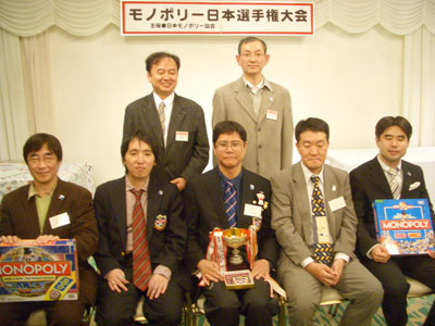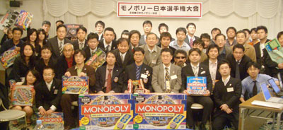 | 2008年度モノポリー日本プレーヤー権 全国大会結果報告(その7) こんにちは。 昨年の日本一決定戦 「2008年度モノポリー日本選手権全国大会」は 去る2008年11月15日、16日に 東京・中野サンプラザで開催されました。 その7回目、最終のご報告となります。 今は日本チャンピオンが決まる決勝。 勝負所となっております。 この時間帯、一同のマークは、 カラーグループの経営に成功し、 順調にレンタル料を稼いでいる 矢田貝さんへ向けられている感があります。 ただし、矢田貝さんが経営しているライトパープルは、 他のプレーヤーの止まる確率が低いうえ、 破壊力が不足しているので、 まだまだ予断を許さない状況です。 矢田貝さんも、今経営するカラーグループを 他のプレーヤーに譲って、 確率、破壊力ともに上回る カラーグループの経営に乗り換えることを 考えていないわけはないでしょう。 そんな状況下で実はこっそり力を蓄えていたのが、 石川@2007年日本チャンピオン。 石川さんが経営されているカラーグループはオレンジ。 止まる確率がやたらに高いため、 日本では最強のカラーグループと呼ばれます。 着々と財力を蓄え、 ついにはオレンジに家が9軒*建つまでになりました。 逆転をうかがうところまでになっていました。 *オレンジに家9軒 モノポリーでは通常、各マスに3軒家を建てるのが、 経営効率がいいとされます。 3軒目に急にレンタル料が跳ね上がるからです。 オレンジは3マスですので3軒づつ、 合計9軒を建てることになります。 オレンジはモノポリーで止まる確率の高さを 誇っています。 止まる確率の低いライトパープルとは 圧倒的な差があります。 石川選手はグディニャ(地中海通りに相当)まできており、 これから百田さんの経営するライトブルー、 矢田貝さんの経営するライトパープルといった 「敵地」に挑まねばなりません。 ここからは本当に一投、一手の違いが 勝敗を分けるポイントとなってきます。 しかしここで状況が一変します。 百田選手がオレンジのバンクーバー (ニューヨーク通りに相当)に先に止まってしまいます。 現金をあまりもっていなかった百田さんにとって 痛恨の出来事。 これで百田さんの経営するライトブルーの家は全て崩壊。 オレンジを経営する石川さんにとっては、 目の前に家が林立するライトブルーが 少し脅威だったのですが、いきなり楽な局面になりました。 一方、石川さんをライバル視する矢田貝さんにとっては、 痛恨の出来事! 矢田貝さんにとって、たとえ自分の収入にならなくても、 ライバルの石川さんが苦しむのは大歓迎。 したがって、矢田貝さんは百田さんを応援していたのです。 こうなると矢田貝さんはあせります。 今まで圧倒的優位を築いてきたのですが、 一気に逆転されてしまいました。 栄光の日本チャンピオン間近から、 一気に奈落の底に落とされた気分だったでしょうね。 このままでは矢田貝さんは負けてしまうかもしれません。 ここで矢田貝さんはどんどん動きます。 百田さんが経営に失敗したライトブルー。 そのまま放置していては、ライバルの石川さんが楽すぎる、 ということで、そのライトブルーに再び家を林立させ、 石川さんを苦しめることをもくろんでいます。 結果的に、今まで一度もカラーグループの経営をしていない 柴田さんに、ライトブルーを経営してもらう交渉を 成立させました。 この交渉では明らかに矢田貝さんに厳しい条件。 うまくいけば自分が刑務所にいる*間に、 石川さんをライトブルーとライトパープルで 多段攻撃を食らわせて、 オレンジを崩すことができるかもしれません。 *刑務所にいる モノポリーでは順調にいけば 刑務所に3回とどまることができます。 一種の「お休み」ですね。 でもこの間もレンタル料を支払う可能性がなく、 しかも自身の経営する土地の レンタル料を受け取ることができますので、 ただのお休みというより、 非常にうれしい「お休み」でして、 モノポリーの世界では お願いしてでも刑務所に入りたいという 状況も出てきます。 ただし、サイコロをふってゾロ目が出た場合は、 強制的に出所しなければなりません。 かくして、経営者を代えて 再びライトブルーには家が建ち並びます。 石川さんから見れば、いったんは 視界が開けたと思った場所に、 間髪を入れずにすぐまたホテルが建ち並ぶといった 光景となります。 モノポリーはこのように勝負所では どんどん状況が変わります。 まさに「天国と地獄」状態ですね。 最初に石川さんはきわどくライトブルーをかわしました。 なかなか今日の石川さんはツイています。 そして直後の矢田貝さん。 刑務所に入ったばかりなので、 ゆっくり休んでいたいところです。 でもサイコロは振らなければなりません。 そしてその目はなんと4ゾロ! 強制出所となりました。 オレンジの、家が4軒建つ「上海」 (テネシー通りに相当)へ突っ込んでしまいました。 先に攻撃を食らったのは意外にも、矢田貝さん