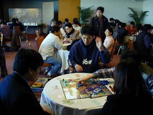 | ディズニーモノポリー記念 ヒルトン東京ベイカップ 結果報告 今回は、2月28日に開催された、 「ディズニーモノポリー記念ヒルトン東京ベイカップ」の 模様をお伝えします。 昨年秋に発売された モノポリーのディズニーバージョン(日本語版)を 記念しての大会です。 会場はなんと、東京ディズニーリゾートにある ディズニーオフィシャルホテルの「ヒルトン東京ベイ」。 まさにディズニーモノポリーの大会にふさわしい場所です。 日本モノポリー協会って、 そんな贅沢な場所使えるほどお金持ちなの? と思われた方、そんなことはないんですけど、 今回は大会の趣旨をご理解いただいた ヒルトン東京ベイさんの 特別のお計らいもあってのことなんです。 参加者は78人。 小学生のお子さんを含むご家族連れも何組か。 モノポリーの大会に初めて参加されたという方が 20人近くおられました。 それどころか、モノポリーをプレイすること自体 初めてとおっしゃるかたも。 今回はそれでもだいじょうぶなんです。 日本モノポリー協会主催の大会では初めての試みですが、 ビギナー専用テーブルというのを設けました。 ベテランプレーヤーがゲームマスターとして加わって、 指導も交えながらゲームメークをしていくというものです。 もちろん、ビギナー専用テーブルのゲーム結果も 大会成績にカウントされます(ゲームマスター以外)から、 優勝することだってできます。 この大会でモノポリーの楽しさを知って、 これからも続けていただければ、 私どもとしましてもうれしい限りです。 もうひとつ、この大会で初めての試みがありました。 それは成績をカウントするしくみです。 3ゲームのうちで、 より多くモノポリー勝ち(他の人をすべて破産させ、 資産を独り占めして終わること。)した人が優勝、 というものです。 回数が同じなら、3回の順位の合計が少ない方が上位。 ですから、 優勝をめざすプレーヤーは(みんなそうでしょうけど(笑)) 制限時間内に決着をつけようと、 テンポのよいゲームが多くなります。 開会式のあと早速1ゲーム目。 60分という、 今までの大会より短い制限時間にもかかわらず、 いくつかのテーブルではモノポリー勝ちで終わって いました。 ビギナーテーブルも、楽しくプレーできたようです。 現世界チャンピオン岡田豊さんがゲームマスターとなり 指導を受けることのできたラッキーなテーブルも ありました。 1ゲームが終わってランチタイム。 ヒルトン東京ベイ内のレストラン「ザ・スクエア」で、 アジアンテイストのビュッフェランチです。 参加者全員で優雅なランチ、 まるでモノポリーの大会じゃないみたいです(笑)。 ランチタイムが終わって2ゲーム目に突入。 さらに熱戦が繰り広げられましたが、 2ゲームを終わってモノポリー勝ち2回の人はいません。 ということは、モノポリー勝ち1回の人はもちろん、 0回の人でもまだ優勝のチャンスが残っています。 しかもこの大会ではテーブルの組み合わせが それまでの成績に関係なく決まりますから、 どのテーブルから優勝者が出るかまったくわかりません。 3ゲーム目の制限時間は 1、2ゲーム目より少し長い75分。 みんなこの75分間にすべてをかけます。 さらにさらに熱戦が繰り広げられ、 時間がまだ相当残っている段階で、 遠く札幌からこの大会に駆けつけた山本尚意さんが 2回目のモノポリー勝ちを達成。 このままいけば山本さんの優勝です。 でもまだわかりません。 モノポリー勝ち1回の野呂夏雄さんが、 かなり優勢な展開で、このゲームの1位はほぼ堅いものの、 モノポリー勝ちできるかどうか、 というところです。 野呂さんはモノポリー勝ち以外のゲームも1位ですから、 このゲームでモノポリー勝ちすれば 山本さんの成績を上回ります。 1人、2人と破産していき、 最後にしぶとく(笑)残るのは滋賀県から参加の 今井清嗣さん。 テンポよくダイスを振るものの、 きわどく野呂さんのエリアをすり抜けます。 もう時間がない。 これが最後のひと振りか。 セーフ、だがゾロ目でもうひと振り。 ここでつかまりました。 今井さん破産で、野呂さんの優勝決定です。 野呂さんは、3ゲームとも1位、 うち2回がモノポリー勝ちという文句のない成績で、 プーさんの優勝トロフィーと、 2004年度モノポリー日本選手権全国大会の出場権を 手にされました。 そのほかの方々も、 モノポリーを十分楽しんでいただけたようです。 表彰式では3位までの方に ディズニーキャラクターのトロフィーが渡され、 その他にも多くの方が抽選で、 いろんなディズニーグッズや、 ディズニーモノポリーの発売元である トミーダイレクトさんのご厚意により提供された ディズニーモノポリーのボードを 手にされました。 4時前にはすべてが終わり、 ディズニーランド・ディズニーシーの スターライトに繰り出した方も多かったようです。 いつものモノポリー大会とはちょっと違った雰囲気、 でもモノポリー本来の楽しさが十分味わえた 大会