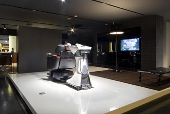▲理容室向けの椅子やシャンプー機器が展示されている