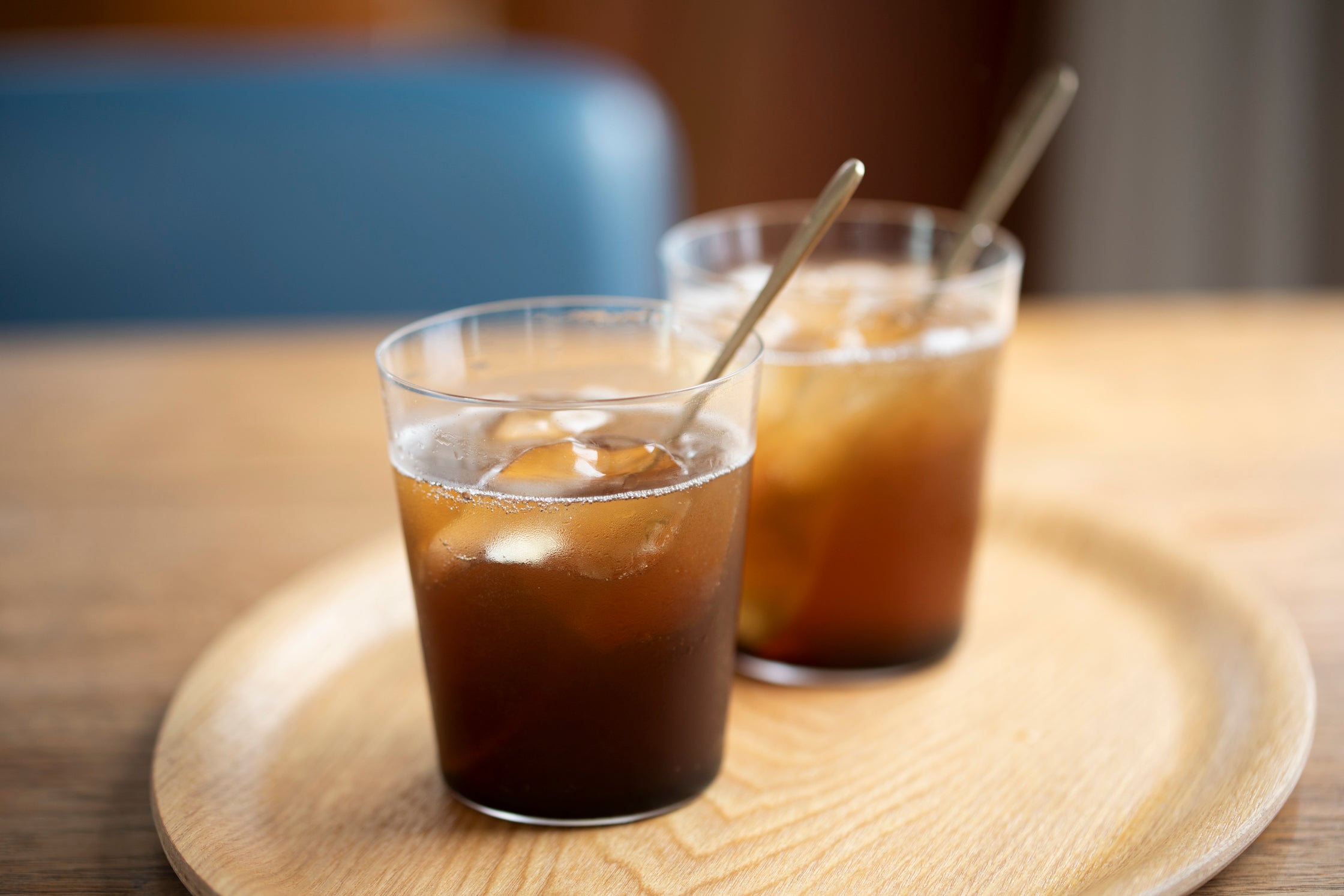 - 1に残りの炭酸水を入れ軽くひとまぜし、お好みで氷を加えます。