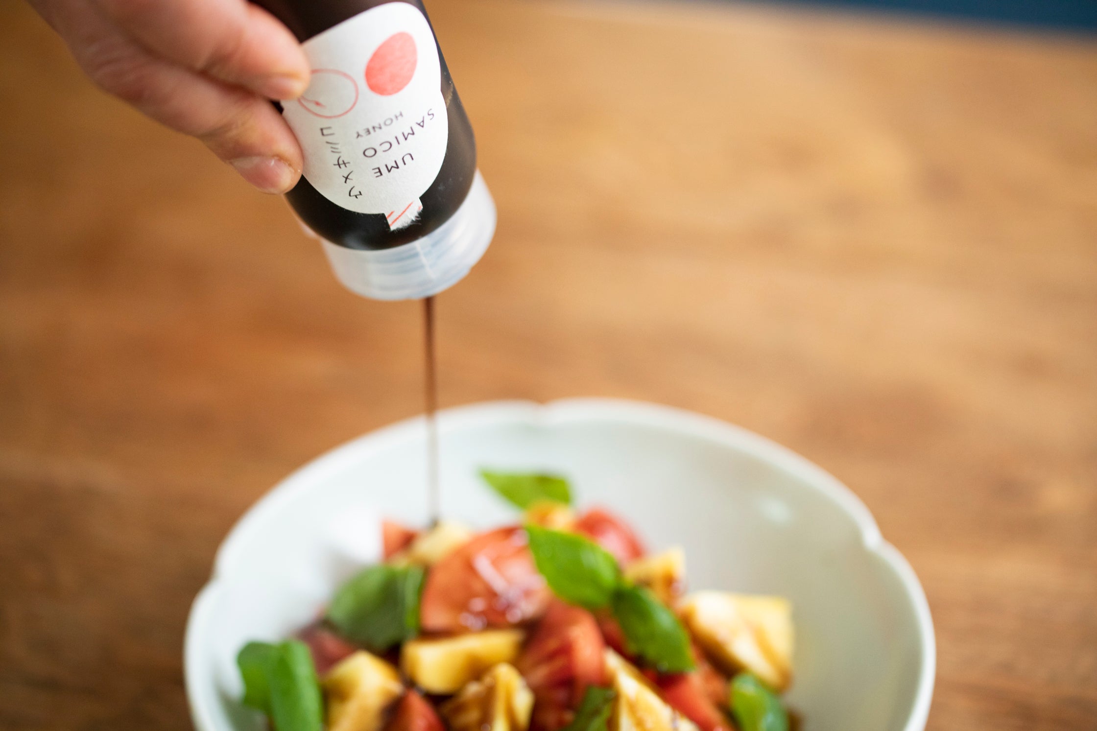 - 器に1を盛り付けます。梅酢、オリーブ油、ウメサミコを回しかけ、バジルをちぎりながら散らします。