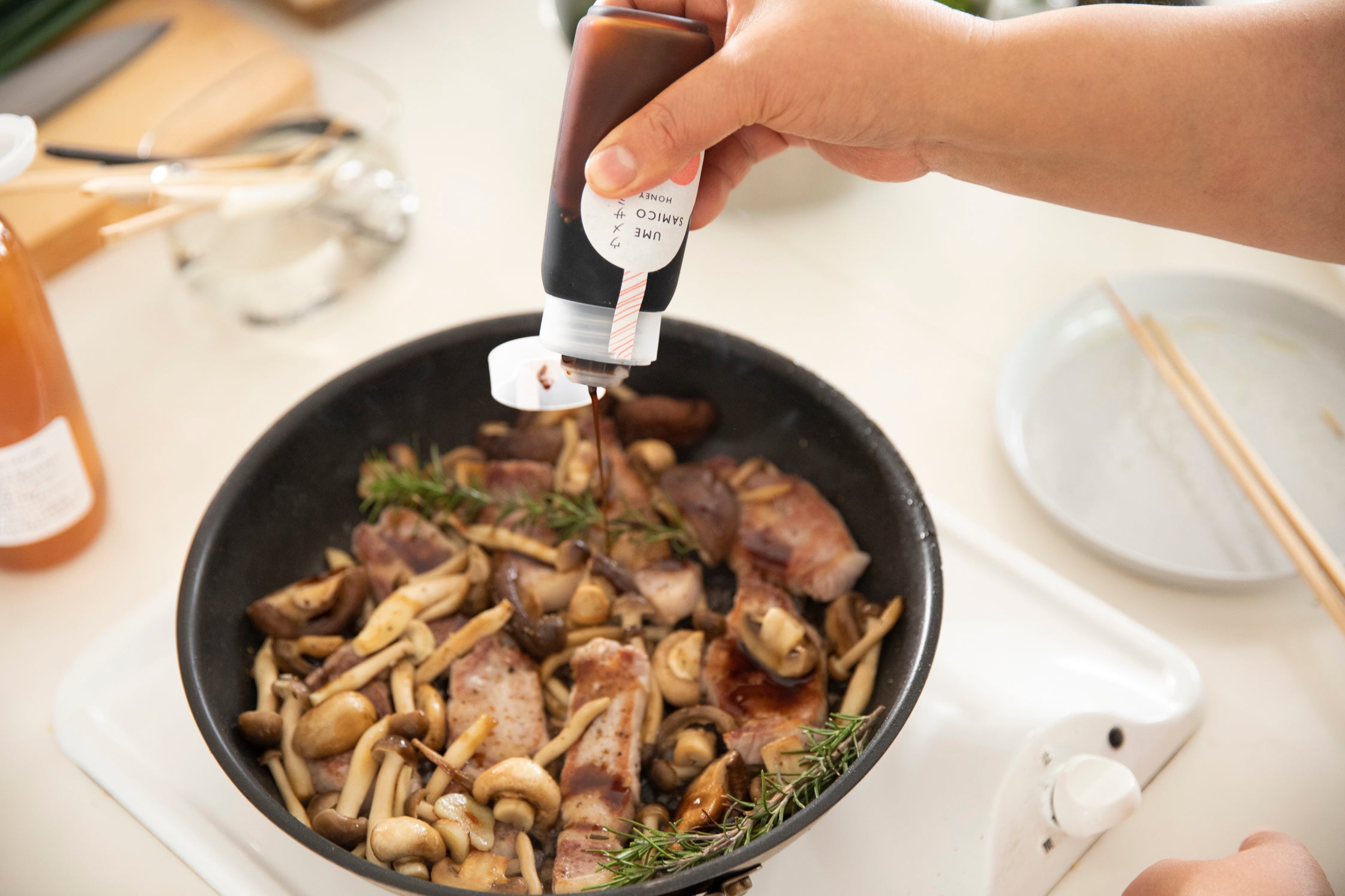 - 酒、しょう油、ウメサミコを加え、中火で加熱したまま、全体にたれを絡めます。