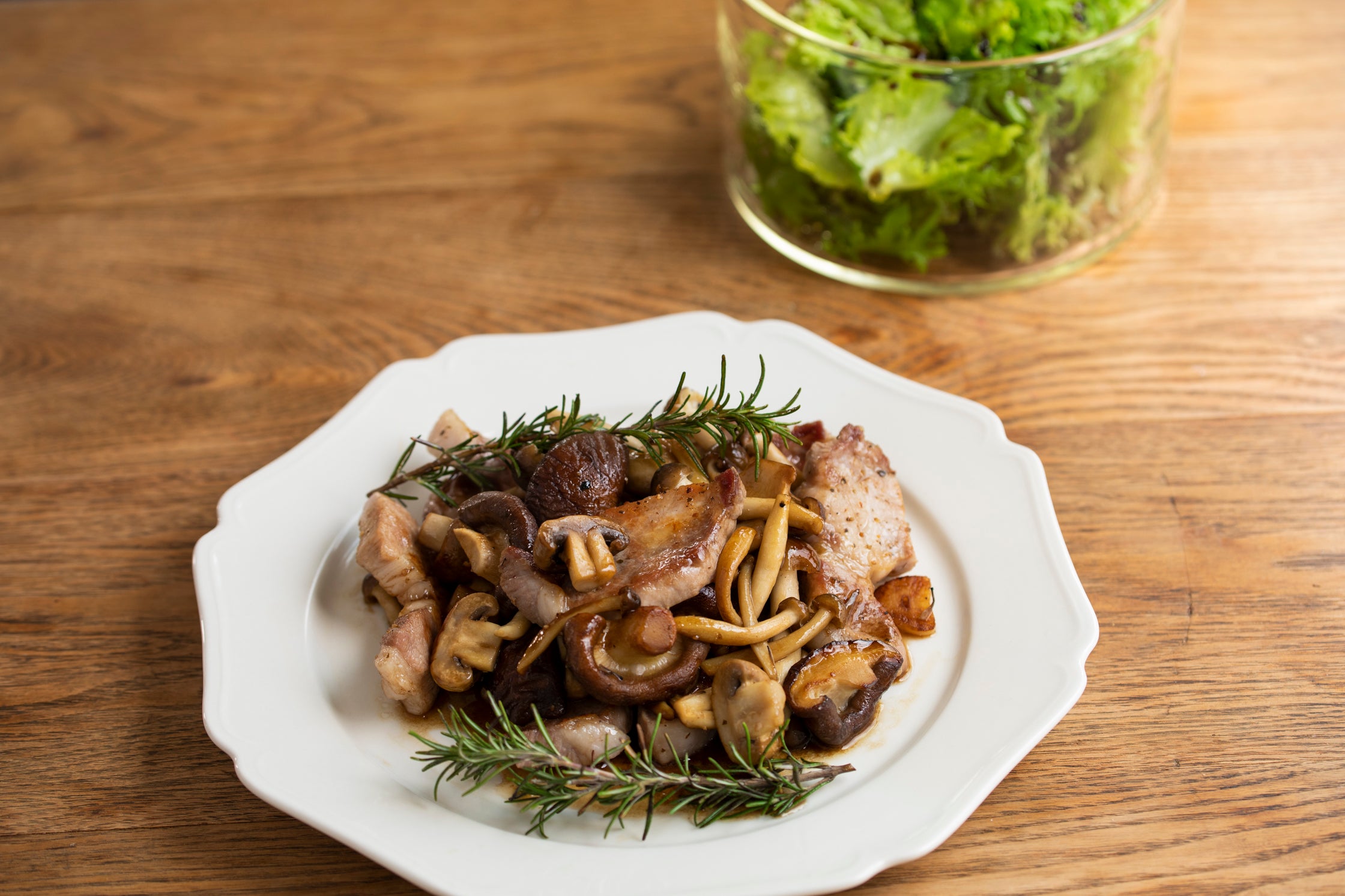 - フライパンにオリーブ油を熱し、生しいたけとしめじ、マッシュルームを入れ、塩をひとつまみ振り、中火で炒めます。全体に火が通ったら一旦お皿に取り出します。