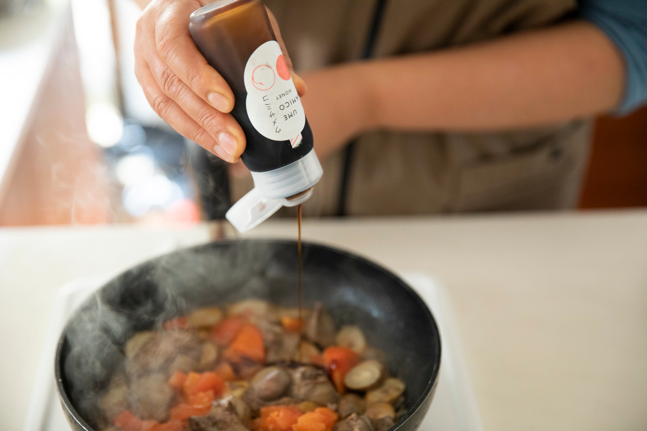 梅酢の塩分を落として煮詰め、はちみつとかくはん。