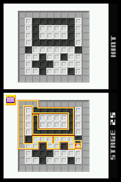 | ルールはすっご〜く簡単。 ピースと呼ばれるパネルを、 一筆書きでなぞって消していくだけの パズルゲームなんです。 タッチペンを使って、 一筆書きでピースをなぞると、 白いピースは黒いピースに、 また黒いピースは白いピースに反転します。 このとき横のラインが、 黒または白にそろうと その列が消えるという仕組みです。 言葉で説明するとちょっとややこしいんですが、 遊んでみると、 まさに「直感」で楽しめるゲームなんです。 画面の上から次々落ちてくるピースを、 すばやく消していくチャレンジモードや、 クイズのように問題をクリアーしていく チェックメイトモード、 ニンテンドーDSのワイヤレス通信を使って、 友だちと対戦ができるバーサスモードなど、 遊び方、楽しみ方もいろいろ。 黒と白のピースを眺めながら、 「あっ、そうか!」と 答えがひらめいたときの気持ちよさは格別です。 ちなみに、『直感ヒトフデ』の続編に 『通勤ヒトフデ』という 作品もあります。 『直感ヒトフデ』にハマった人は、 『通勤ヒトフデ』にもチャレンジしてみては? |