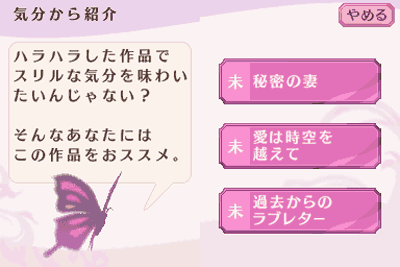 ハーレクイン社厳選の 33作品が収録されている本作だからこそ 何を読もうか迷ったときのサポート機能が充実。 気分や性格診断からおすすめ作品を 選んでくれるんです。