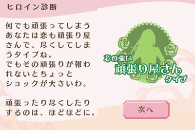 2 ヒロイン診断 こちらもランダムに5つの設問が出され、 自分の「ヒロインタイプ」を診断してくれます。 そのタイプにあった作品を選んでくれるんです。