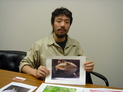 お気に入りのトカゲ写真を持った山口さんをパチリ。