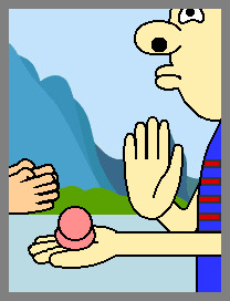 手のひらにおまんじゅうを乗せて‥‥ (ゲームと同じポーズを取る)。 |