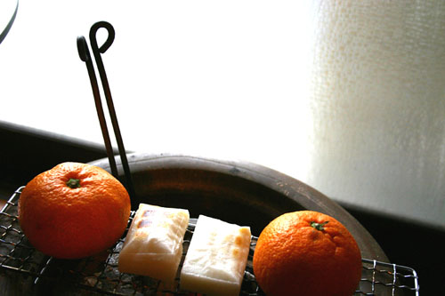 長い竹の先にはりがねをつけ、そこに<福餅>を刺し、