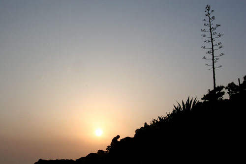 夕日が沈む中、岩と一体になって絵を描いているのは