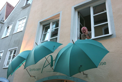 「今日も雨だねぇ」と、カサ屋の親父さん。