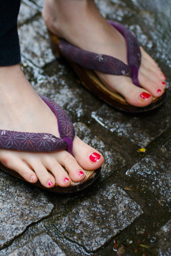 神楽坂をお散歩。ぬれた石畳に、素足が映える。