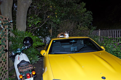 新郎の高級車の屋根の上で、留守番猫が