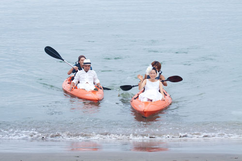 な、なんと! 新郎新婦はカヤックで登場〜♪