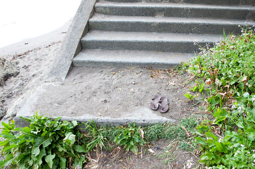 海に入ったサーファーご主人さまを待つ、ビーサン一足。