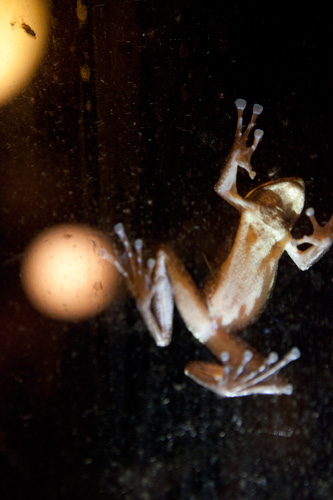 お?! 白あごカエルが窓にペタッ。
