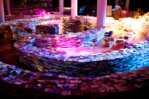 積み上げた本や雑誌に照明を当てた