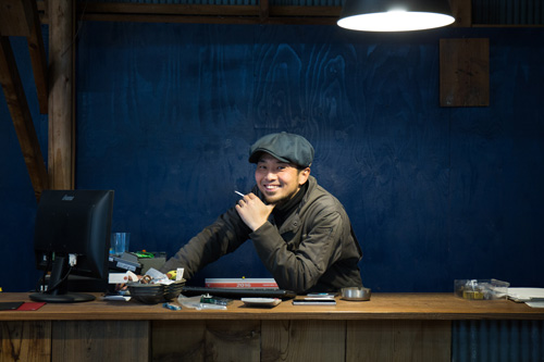 作業の手を止め、自作のカウンターで一服する彼は ヨーロッパのヴィンテージバイクを専門に扱っている 「ritmo albero」のオーナー、ツッチー。
