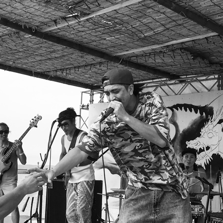 遊びに行った百道浜のフェスで、スマホ激写。 客席からグラスを手渡される、博多スタイルの歓迎を受ける 北海道から糸島に移住してきたラッパー・Elias。