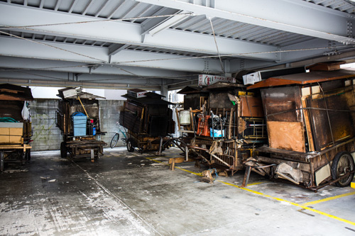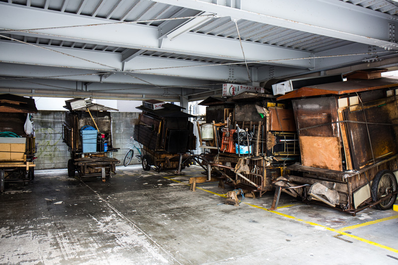福岡の市内を、撮影場所に向かって歩いていたら 博多名物オープンエアーレストラン業界の、 屋台パーキングを発見! これを営業場所まで 「運ぶ」仕事のプロもいるらしい。 機関車トーマスの世界のように、 それぞれがキャラが明確に際立たせている。 ここはまさに、中洲のバックステージだなぁ──。 @Fukuoka・Fukuoka 2017
