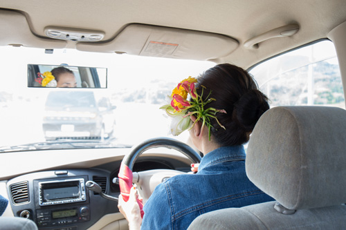 髪に花をつけ、ばっちりメイキャップで イベント会場へ向かう妻。 向かう途中、すれ違う対向車の運転手が ちょっとどきっとした表情で、皆、一様にふと目を留めては 笑いを堪えている様が、面白かった。 @Itoshima・Fukuoka 2017