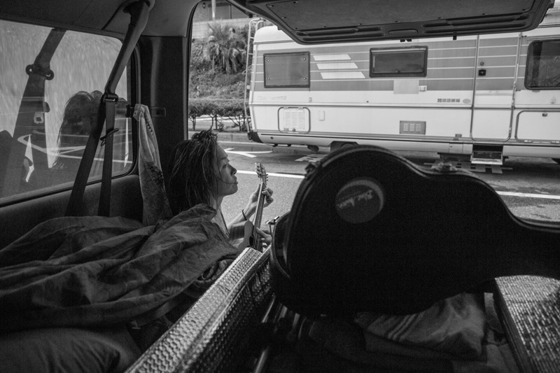皆で泳ぎに行って、旅の途中のワゴンでウクレレ。