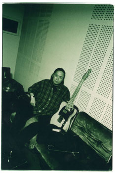 座って、ギター持ってる写真です。 |