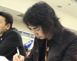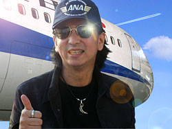 第1回 天文物理に 無駄にくわしいミュージシャン。 「オレの5大ニュース」の 記念すべきひとつめのニュースに 田島貴男さんが選んだのは「飛行機」でした。 まずはこの際「やりたかったことをやってみよう!」 と思っているふしがある、田島さんです。 「どうもみなさん! 田島です。 飛行機にはつねづね興味がありまして、 サン・テグジュペリの『星の王子さま』だったっけ、 いや違う違う、『夜間飛行』か。 あの本を読んで、オレもいつか操縦したいなあ、 と思ってね。 調布にある飛行場にもよく行ってるんです。 あそこにサ店があって、 い〜い作詞ポイントなんですよね、 ッハハハハ!」 のっけからハイテンションです。 今回見学させていただくのは、 羽田空港の整備場地区にある ANA機体メンテナンスセンターです。 ここは、前もって予約をしておけば 誰でも無料で見学ができるんですよ。 ![]() 館内ロビーにある立看板から顔を出し、 はしゃぐ田島さん。 工場のロビーには、使わなくなったコックピットが 設置してあります。さっそく腰をおろし、 スイッチ類をやたらさわります。 「こーれは、男の子ゴコロをくすぐるね。 オレは電車マニアだったんですよ、ガキのころ。 畳のヘリにそって電車をはしらせてさ、 あのころの気持ちを思い出します」 ![]() ごちゃごちゃしたスイッチ類に心魅かれるかんじは、 男であれば、誰もがわかる喜びですね。 田島さんは、岡本太郎の特集コンテンツ 「なんだ、これは!」で、 Tシャツに銀河の絵を描いたことから、 宇宙に興味をお持ちなのだとは思っていましたが、 飛行機が好きなことは知りませんでした。 待ち時間は、宇宙話に花が咲きます。 「宇宙情報系は、アツいですよね、ここ何年かは。 ハッブル宇宙望遠鏡の写真、サイトで見ました? あとね、あれだよ、火星に水の痕跡があったとか、 知ってます? あっ、知らない? でも、生命がいたかどうかはわかんないよねえ。 地球だって、30数億年までは何もなかったんでしょ? カッシーニの画像も見た? 土星の輪。 あーれ、やばかったっすね!!(以下略)」 とかなんとか話しているうちに、 工場見学のはじまりです。 まずは、教室に入って 飛行機についてのレクチャーを受けます。 机には「ようこそ、機体メンテナンスセンターへ」 と書かれたしおりがスタンバイされていて、 飛行機のこまかい部分の名称が記されています。 「こういうの、見るだけでたのしいじゃん!」 ウキウキワクワク度が高まります。 頭ひとつぶん出ているのが田島さんです。 今日いっしょに見学をするのは、 小学生が約30名、 おじさまがたの団体が約20名、 そして、アテンダント研修とおぼしき ギャルのみなさんが10名ほどいらっしゃいます。 こうやって授業を受けるのは、きっと久しぶりですね。 田島さんは、どんな生徒さんだったんですか? 「すっごい睡魔に襲われて、寝ていると 先生にバーンってどつかれて、 みんなに大注目された瞬間にヨダレがバーって垂れて 爆笑されたことがありました。 でもオレは起きた瞬間 なんでみんなが爆笑してるのか、わかんなかった。 先生も笑ってたよ。 でも今日は寝てらんないな!!」 そうです、子どもたちの手前ということもあります。 おっ!!! 先生が話しはじめたとたん、カバンから ノートを取り出した田島さん。 ![]() ここにいるどの生徒よりも 「やる気」でいらっしゃるようです。 めちゃめちゃノートを とりまくっています。 見渡しても、こんなに熱心な生徒は やはりほかにいません!! 何やらわからない「気」があたりにみなぎっています。 授業は、たのしいクイズ形式で進みます。 なになに、正解すると全日空のシールがもらえる? これは、いやがおうにも燃えてきますね。 ![]() よっしゃ、やるぞ! 子ども相手にメラメラしています。 先生からのクイズ、まずは第一問目です。 「同じ飛行機でも 国内線と国際線では、お客さまの数が違います。 国際線のほうが乗客数が少ないんです。 それは、あるものを、国際線では よけいに積まなくてはならないからです。 あるもの、とは、いったいなんでしょう?」 さすが田島さん、すぐに正解を思い描きました。 燃料に決まってるじゃん!! 「ハイ!」「ハイ!」 手を挙げる、小学生と田島さん。 しかし、先生からは指されず。 田島さんは目に見えて ショボクレ気味になってしまいました。 くそぅノートとってないくせに、と 心の声が聞こえるようです。 くじけるな、のっぽ番長。 そんなMr.ショボクレに次なるクイズが。 「395トンの重量の機体を離陸させるための エンジンの力は何トンでしょう?」 田島さん、考え込みます。 「うう〜うう〜4000。 4000トンッ(小声)」 しかし先生は、ホワイトボードにこう大書しました。 「エンジンの力=105トン」 ははあ、ちょーっとはずれてしまいましたね、番長。 ああ、みるみる番長の顔が暗く なっていきます。 「そうか‥‥バカだなオレ‥‥、 翼だ、翼だな」 翼の力を計算に入れていなかった自分を 