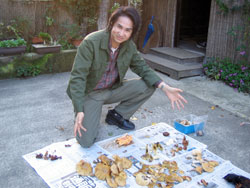 ■ニュース その1■ キノコ狩り、恐怖の迷宮。 第12回 知らないあいだに、キノコ鍋が。 中山さんのお店に到着した 田島貴男ニュース番長は、 採ったキノコを 新聞紙に並べて選定します。 食べられるキノコを選び、 これから料理しようという算段です。 どうやら、番長は、意外に「量」を採っています。 そして、持って帰ってくるのがうまいらしく、 全部のキノコのかたちがきれいに整っています。 「きれいに持って帰ってきたねぇ」 と、キノコ・ザ・トリオのみなさんも、 ほめてくださっています。 本日のお宝キノコオールスターです。