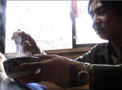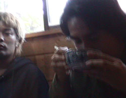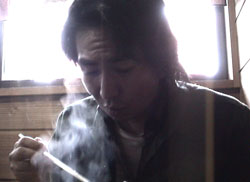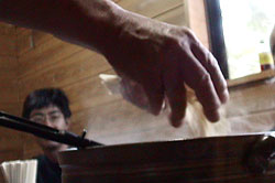 これはなんのキノコだろうな? アブラシメジかな? あっっつ。 フハフハ、ムシャムシャ。 ズズズー。 もういっぱい。 キノコが少なくなると、 乾麺のきしめんをバリバリに折って入れて‥‥ あ、さらに食ったらまたうまい。 ズズズズー。 ZZZZZー ZZZZZーん? くり返し鍋に手をのばす番長。
